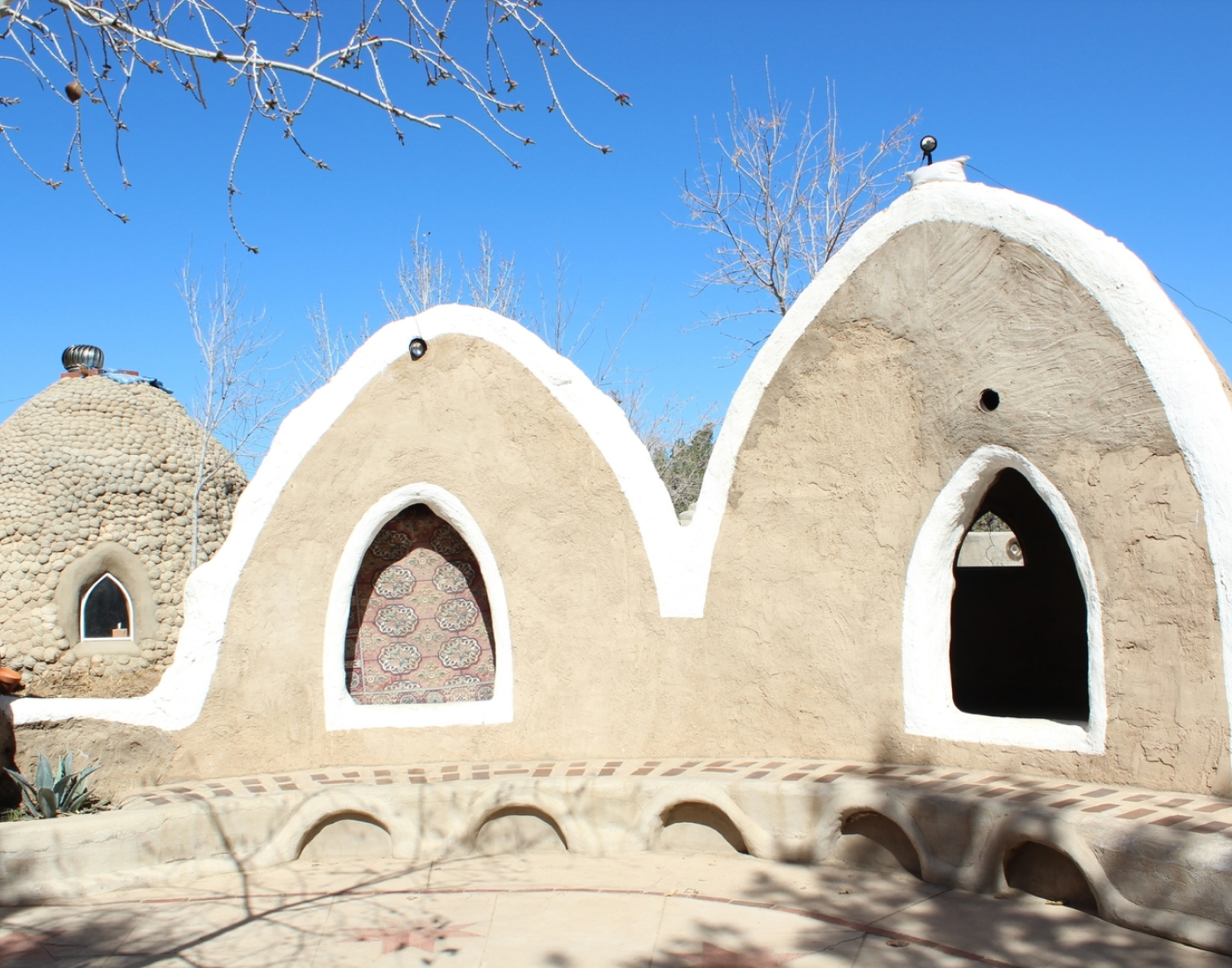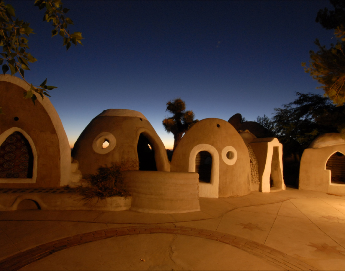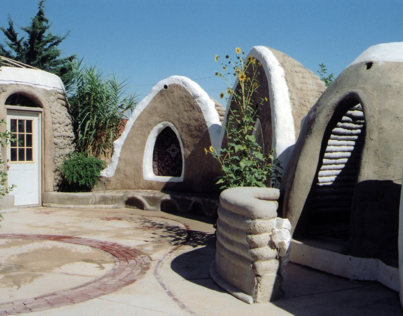 Each dome in the village has a slightly different design to show the versatility of SuperAdobe, but also the simplicity. These small domes can each be built in about one day with 5-7 builders with only basic on-site training. They can be stabilized and plastered or just left unstabilized for temporary shelter in a disaster situation. The domes, pond landscaping and even the courtyard floor are all made of stabilized earth from the site. The Village is a living research tool, where the effects of sun, wind, water, freeze, heat and traffic are all monitored over the years. Workshop participants sleep in these small domes during their stay at CalEarth. In our "Core A" Dome Building and Core Curriculum 4 day workshops students learn to build these small shelters.
