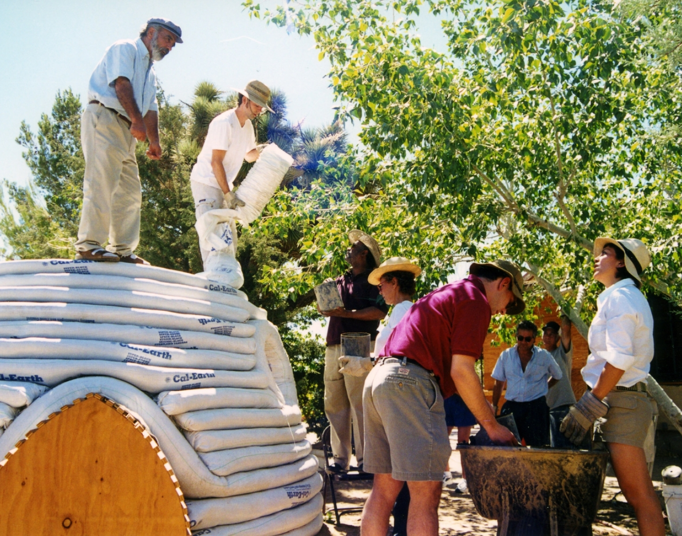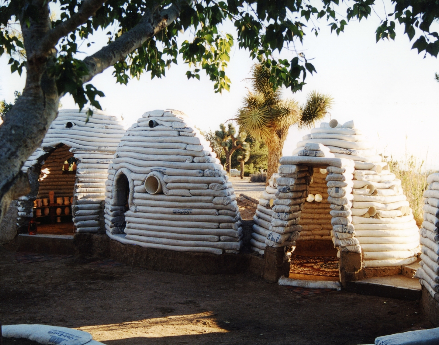 The "Water Village" is the first of two emergency shelter villages at CalEarth. In July of 2001, a visit from the United Nations headed by the Director of the UNDP Emergency Response Division with his team from New York, participated in a CalEarth workshop for these emergency shelters. They each slept in one to experience their quality. Their very positive response was recorded by the Reuters World News Agency.